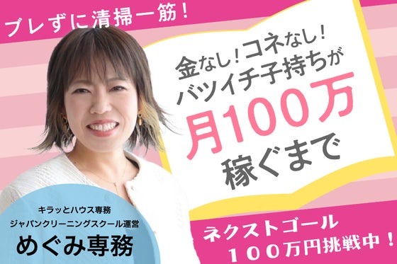 神奈川県のハウスクリーニング専門店「キラッとハウス」めぐみ専務。5年前、女性の清掃職人になるために独立。ブログで現在の夫であり社長の一輝店長を見つけて、その清掃ノウハウと意識の高さに感激して弟子入り。 清掃オタク夫婦として、ラスベガスに渡米して国内で第1号となる清掃資格を取得しに行ってからは、TVや雑誌からの取材依頼も多い。 キラッとハウスへ入社して店舗経営に携わり、5年で売上5倍、従業員0人→6人のお店へ成長させる。 3年前に立ち上げたセミナー事業部「Japan Cleaning School」は、【清掃業の発展からいつまでも綺麗な日本を】をテーマに掲げ、清掃業の経営者に向けた技術や経営セミナーを行い、オンラインサロンを中心に運営。清掃部門の底上げを目指す。